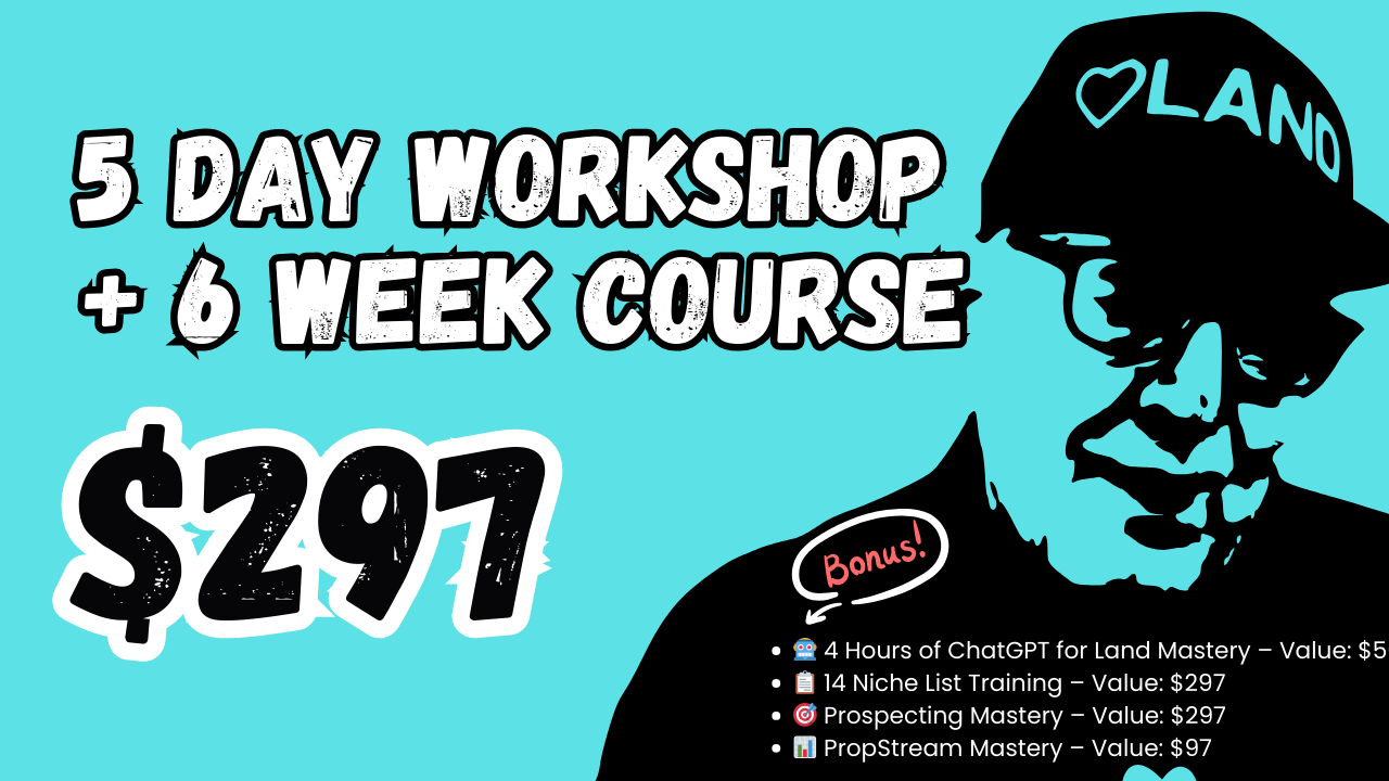 The most complete land-flipping training I’ve ever released — including the 5-Day Workshop Replay + 6-Week Course + every Mastery training you need to start closing deals in weeks, not months.